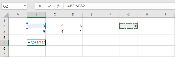 4가지 유형의 셀 참조 (절대, 혼합 참조 (2x) 및 상대)를 모두 순환합니다. 예를 들어 아래의 B5 셀을 선택하고 수식 입력 줄을 클릭 한 다음 삽입 포인터를 G2 안이나 오른쪽으로 이동 한 다음 F4 키를 누릅니다.