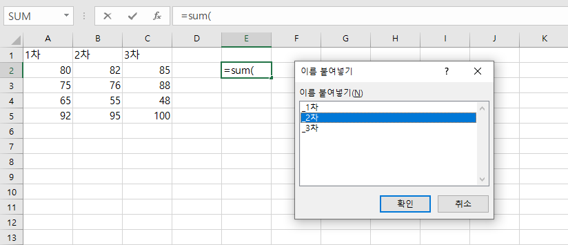 이름 붙여 넣기 대화 상자를 표시합니다. 예를 들어 아래에서 셀 E2를 선택하고 = SUM (을 입력 한 다음 F3 키를 누르고 이름을 선택합니다.