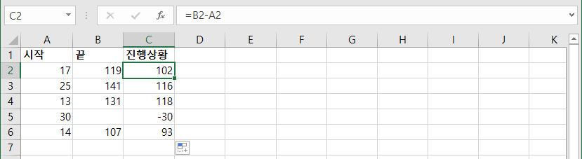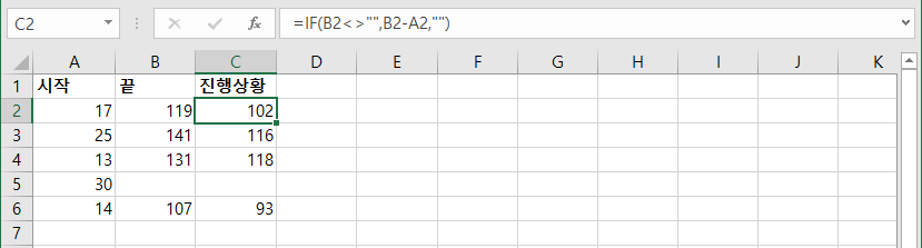 설명 : 종료 값이 비어 있지 않으면 (<>는 같지 않음) IF 함수는 시작 값과 종료 값 사이의 진행률을 계산하고 그렇지 않으면 빈 문자열 (사이에 아무것도없는 두 개의 큰 따옴표)을 표시합니다.