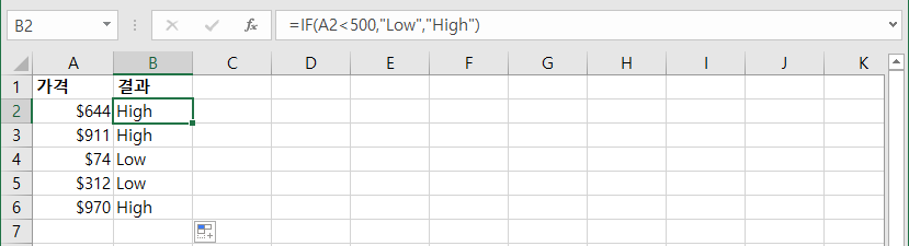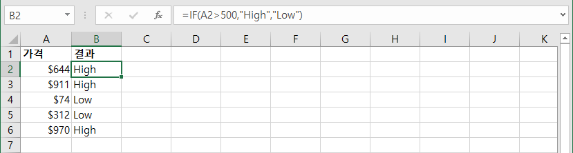 설명 : 가격이 500보다 크면 IF 함수는 High를 반환하고 그렇지 않으면 Low를 반환합니다.