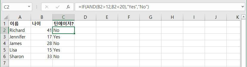 설명 : AND 함수는 사람이 12 세 이상 20 세 미만이면 TRUE를 반환하고 그렇지 않으면 FALSE를 반환합니다. TRUE이면 IF 함수는 Yes를 반환하고 FALSE이면 IF 함수는 No를 반환합니다.