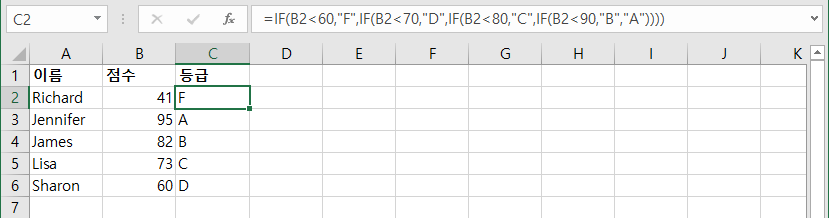 설명 : 점수가 60 미만이면 중첩 된 IF 수식이 F를 반환하고 점수가 60 이상 70 미만이면 수식이 D를 반환하고 점수가 70 이상이고 미만이면 D를 반환합니다. 80이면 수식은 C를 반환하고 점수가 80 이상이고 90 미만이면 B를 반환하고 그렇지 않으면 A를 반환합니다.