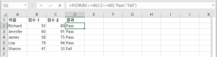 설명 : OR 함수는 하나 이상의 점수가 60 이상이면 TRUE를 반환하고, 그렇지 않으면 FALSE를 반환합니다. TRUE이면 IF 함수는 Pass를 반환하고 FALSE이면 IF 함수는 Fail을 반환합니다.