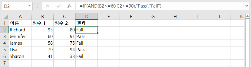 설명 : AND 함수는 첫 번째 점수가 60보다 크거나 같고 두 번째 점수가 90보다 크거나 같으면 TRUE를 반환하고 그렇지 않으면 FALSE를 반환합니다. TRUE이면 IF 함수는 Pass를 반환하고 FALSE이면 IF 함수는 Fail을 반환합니다.