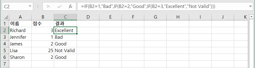 설명 : 점수가 1이면 중첩 된 IF 수식은 Bad를 반환하고, 점수가 2이면 중첩 된 IF 수식은 Good을 반환하고, 점수가 3이면 중첩 된 IF 수식은 Excellent를 반환하고, 그렇지 않으면 Not Valid를 반환합니다. Excel 2016 이상이있는 경우 IFS 기능을 사용하면됩니다.