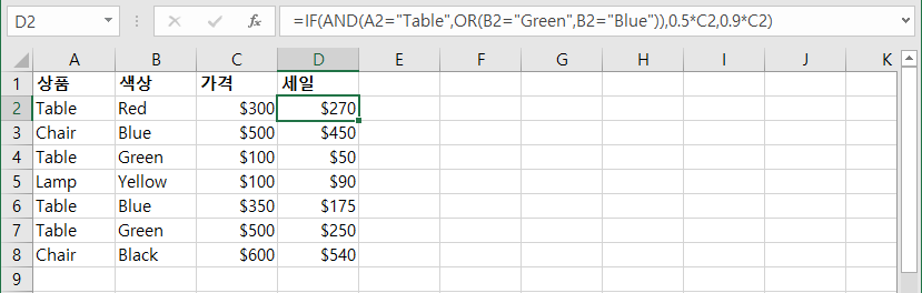 설명 : 위의 AND 함수에는 쉼표로 구분 된 두 개의 인수 (테이블, 녹색 또는 파란색)가 있습니다. AND 함수는 Product가 "Table"과 같고 Color가 "Green"또는 "Blue"와 같으면 TRUE를 반환합니다. TRUE이면 IF 함수는 가격을 50 % 낮추고 FALSE이면 IF 함수는 가격을 10 % 낮춥니다.