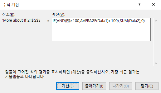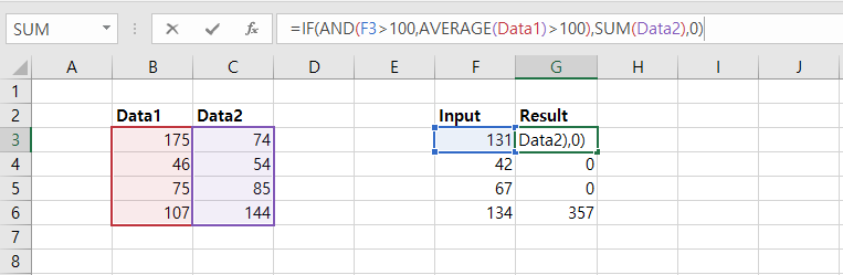 설명 : 입력 값이 100보다 크고 명명 된 범위 Data1에있는 값의 평균이 100보다 크면 AND 함수는 TRUE를 반환하고, 그렇지 않으면 FALSE를 반환합니다. TRUE이면 IF 함수는 Data2의 합계를 반환하고 FALSE이면 IF 함수는 0을 반환합니다.