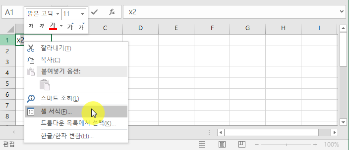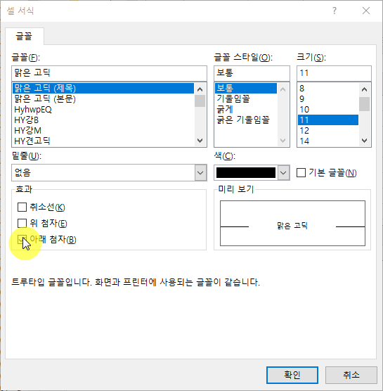 Excel에서 문자를 위 첨자 (기준선 약간 위) 또는 아래 첨자 (기준선 약간 아래)로 쉽게 서식을 지정할 수 있습니다.