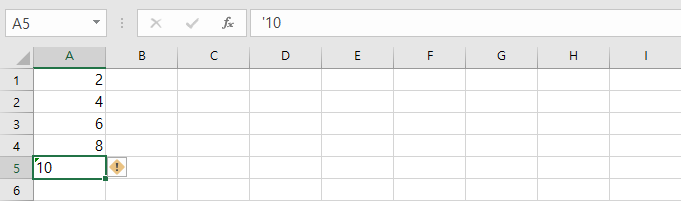 2. 아포스트로피가 앞에 오는 숫자도 텍스트로 처리됩니다. A5 셀을 선택하고 아포스트로피를 수동으로 제거하십시오.
