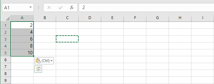 3b. A1 : A5 범위를 선택하고 마우스 오른쪽 단추를 클릭 한 다음 선택하여 붙여 넣기를 클릭합니다.