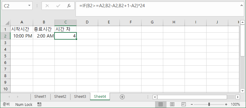 시작 시간이 자정 이전이고 종료 시간이 자정 이후이면 위에 표시된 간단한 수식이 작동하지 않습니다.